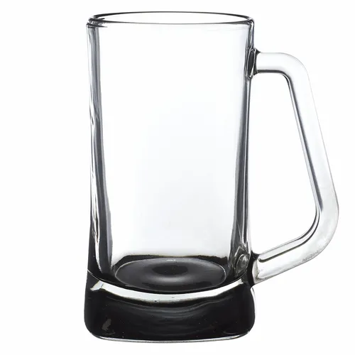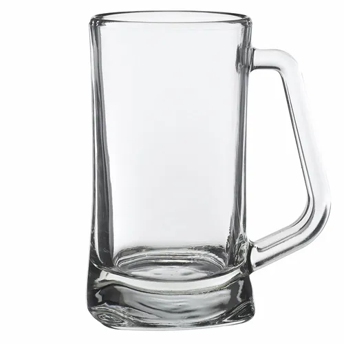 16 oz. Glass Beer Mugs. Thick Squared Bottom. Slanted Handle for Easy Grip. Recommended Hand Wash Only