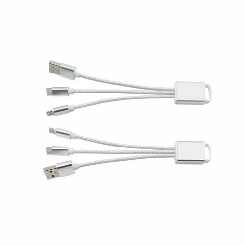 The perfect companion to the stylish tech enthusiast. With the elegant metallic design and durable braided cables this charging cable adds elegance to utility and can be engraved for a subtle refined style or imprinted with color to give your client's logo pop! The cable includes USB, Type-C, Micro-USB/Non-MFi 5-pin Tip combo to cover most Android and other devices.
