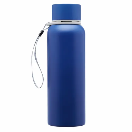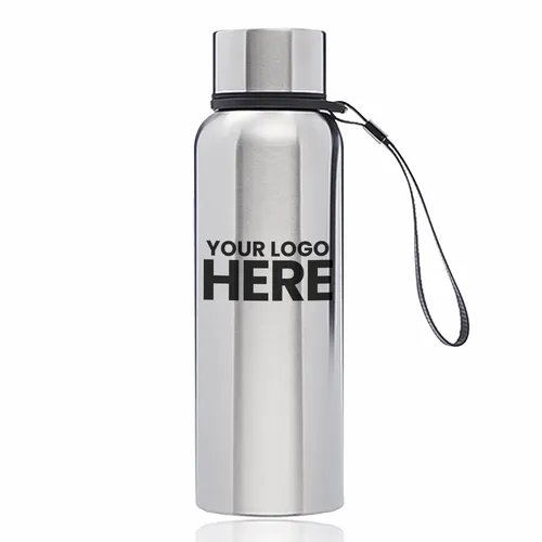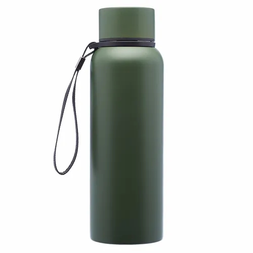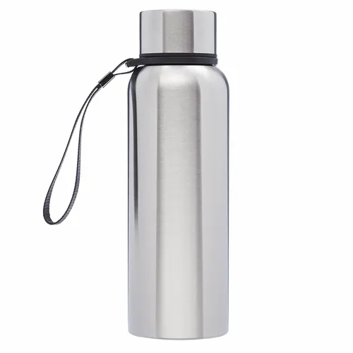 Double Wall Stainless Steel Vacuum Water Bottle. Plastic Lid with Stainless Steel Wrap. With Carrying Strap