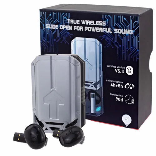 Ultra-low latency gaming true wireless stereo(TWS) earbuds. Features two built-in ultra-clear mics in each earbud to capture vocal sounds accurately. Allowing for clear communication during important business calls and online video meetings. Play music up to 5 hours on a single charge. The charging case sustains up to 22-28 hours of battery life. Specifications: wireless Version: 5.3 Power lnput: DC 5V Battery Capacity: 3.7V/30 mAh Charging Box Capacity: 3.7V/500