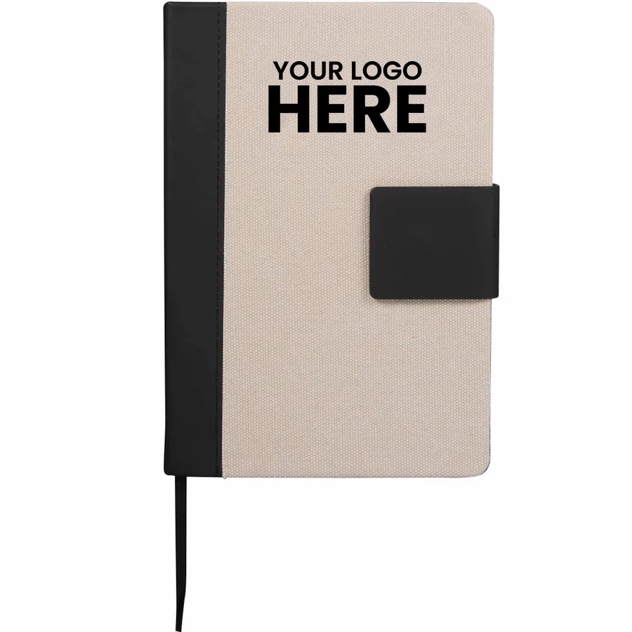 The 5.5 x 8.5 FSC Recycled Canvas Bound Notebook is a stylish choice for daily notes and ideas. Featuring a 100% recycled cotton canvas cover with a recycled PU spine and magnetized closure, this notebook offers both durability and eco-conscious design. Inside, it includes 80 sheets of FSC recycled cream lined paper for a smooth writing experience, along with a black ribbon page marker to keep your place. By choosing this notebook, you’re making a positive impact on the environment through a partnership with 1% For The Planet, as a portion of each sale supports environmental nonprofits.