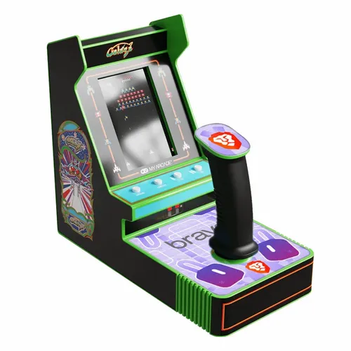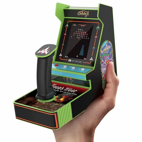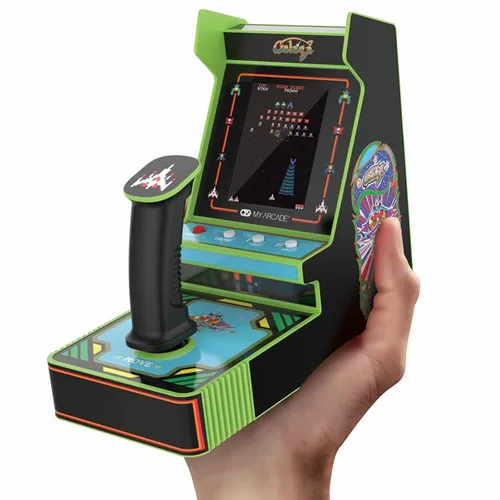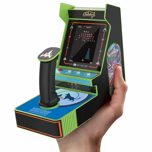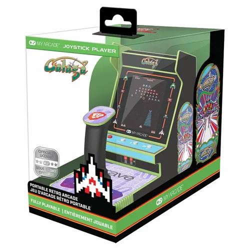 High-resolution 3.5" full-color vertical display, featuring eye-catching artwork inspired by the nostalgic Galaga arcade cabinet!