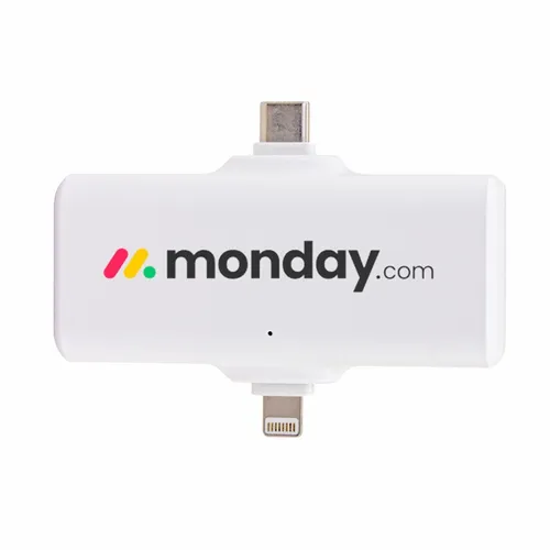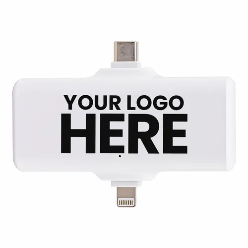 A portable 1800 mAh power bank with a Type-C input/output connector and Lightning output connector. Each connector is covered by a silicone band with caps that helps protect them when not in use.