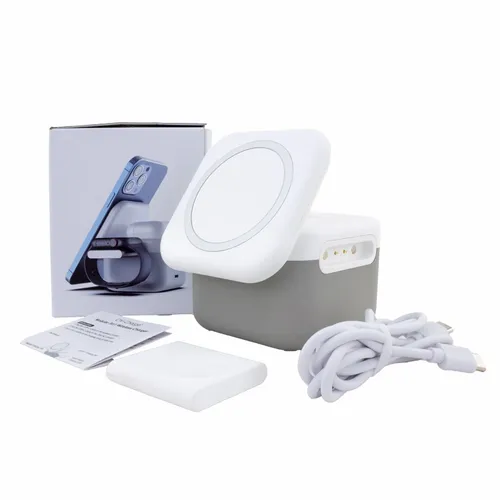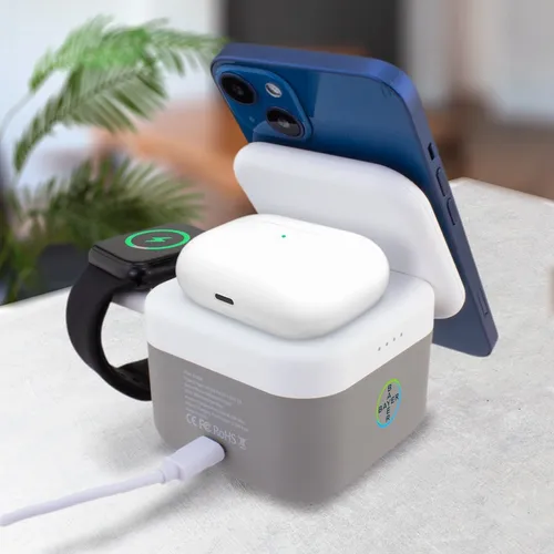 The Chi-Charge Modular 3-in-1 Wireless Charger will charge AirPods, Apple Watch, and a phone all at the same time. It's a cleverly designed compact device that makes it perfect for teams that travel, work in the office, or at home. The three sectional pieces can be assembled quickly and easily to start charging three compatible devices with fast charge technology.