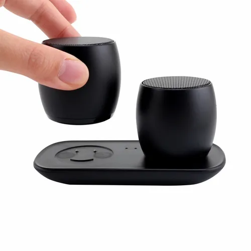 Portable stereo surround sound speakers that come with a beautiful custom full-color sleeve for maximum brand exposure. Simply pair this stylish pair of wireless Speakers to each other, and then to your smartphone to enjoy the sound of your favorite music and movies all around you! You can also loan one to a friend as the Nano Twins can be used independently as well!