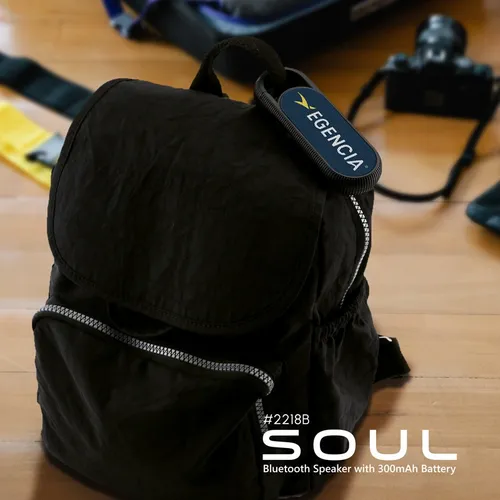 The Soul Speaker is a portable wireless speaker with a lever clip to easily attach to a backpack, handbag or carrying case while traveling.