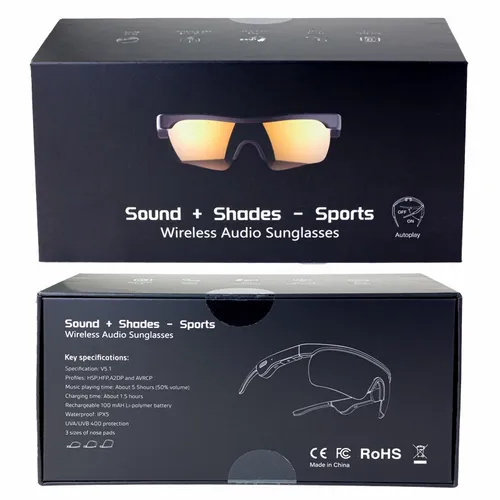 Wireless wireless Audio Sunglasses, wireless specification: V5.0 QCC3034, wireless profiles: HSP,HFP,A2DP and AVRCP, Talk time: About 6 hours (50% volume), Music playing time: About 5.5hours (50% volume), Charging time: About 1.5 hours, Rechargeable 95 mAh Li-polymer battery, Ergonomic Design for Cycling, IPX7 waterproof Qualcomm Aptx, UVA/UVB protection